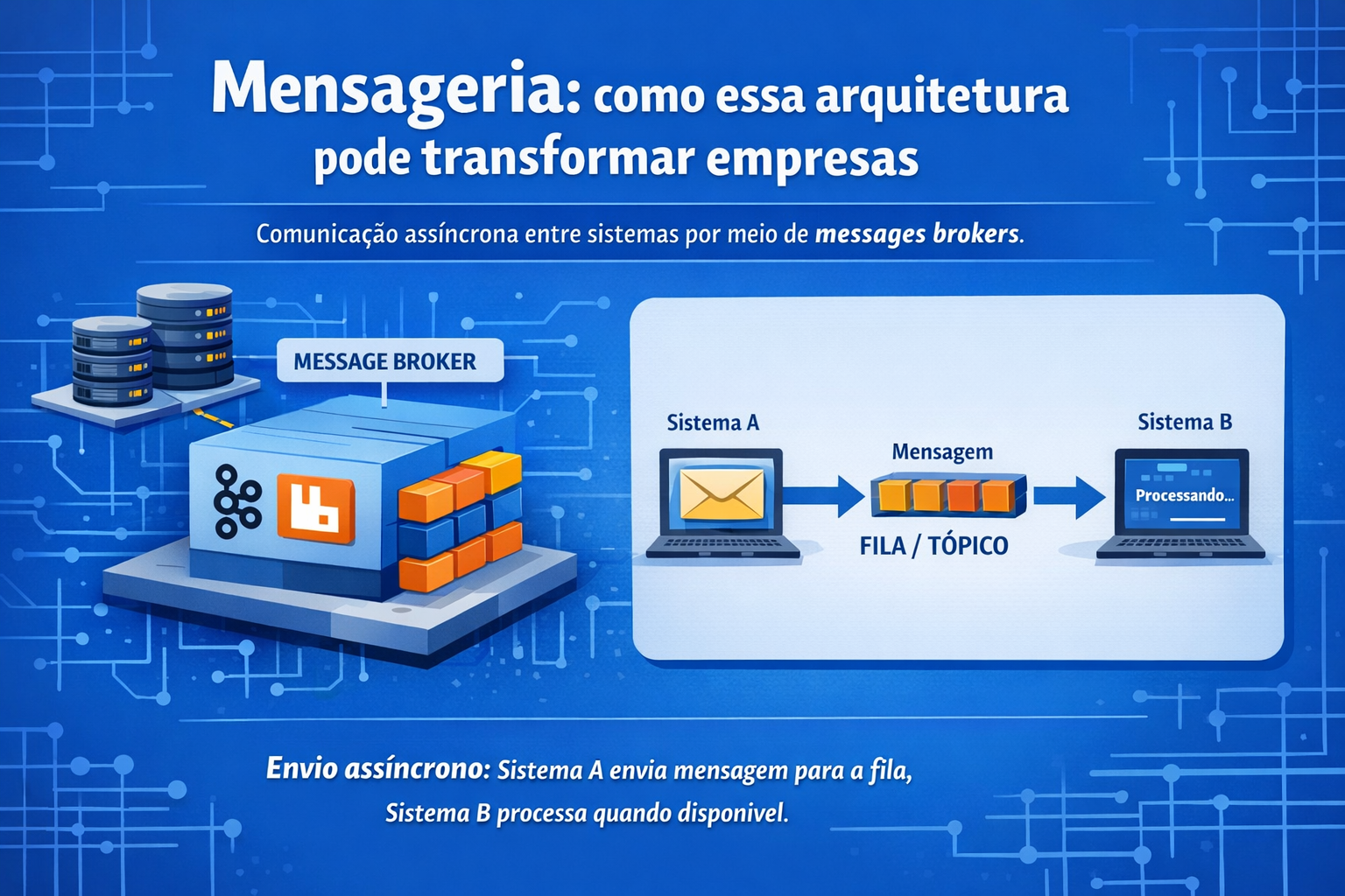 A mensageria para empresas é um modelo de comunicação assíncrona entre sistemas, onde serviços trocam informações por meio de filas ou tópicos, utilizando message brokers como Kafka, RabbitMQ ou AWS SQS.